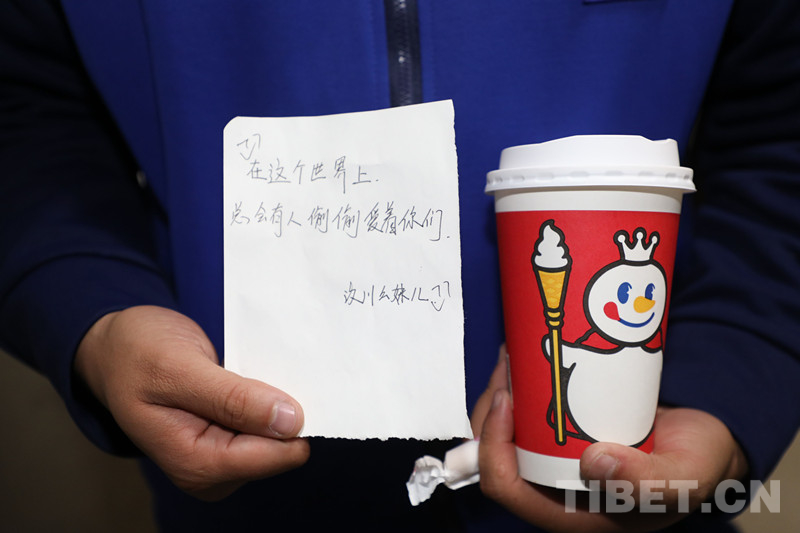 抱著這個還有溫度的大箱子,楊文武趕緊報告了指導員楊路路。打開箱子后,發(fā)現(xiàn)是整整齊齊60杯熱騰騰的奶茶。茶杯上留著一張小紙條,寫著“在這個世界上,總會有人偷偷愛著你們”,落款人“汶川幺妹兒”。指導員和楊文武恍然大悟,肯定是一位熱心的女孩匿名買了奶茶,又讓這對外賣夫婦送過來的。只是不知道是哪位暖心的女孩送了奶茶,因為沒有留下任何聯(lián)系方式,也沒有透露自己的真實姓名。