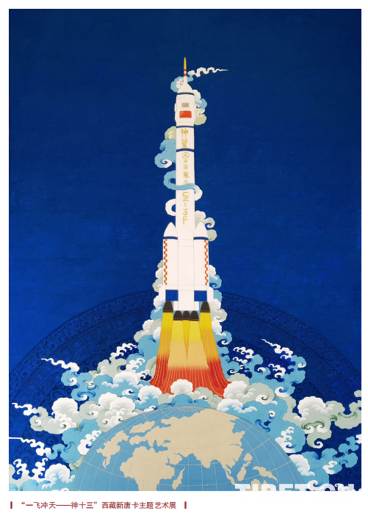 唐卡藝術(shù)家邊巴的新唐卡作品《一飛沖天》,以神舟十三號(hào)為主題,描繪了飛船沖出地球奔向星辰大海的瞬間。飛船、地球、祥云的后面,有一個(gè)融入背景的曼荼羅圖案,象征著西藏傳統(tǒng)的宇宙觀。傳統(tǒng)地道的勉唐派唐卡繪畫語言,采自天然礦物富有環(huán)保特征的厚實(shí)顏色,漢藏融合的審美品位,立足中國(guó)放眼世界的人類命運(yùn)共同體胸懷,正是新時(shí)代新唐卡新融合的藝術(shù)表達(dá)。