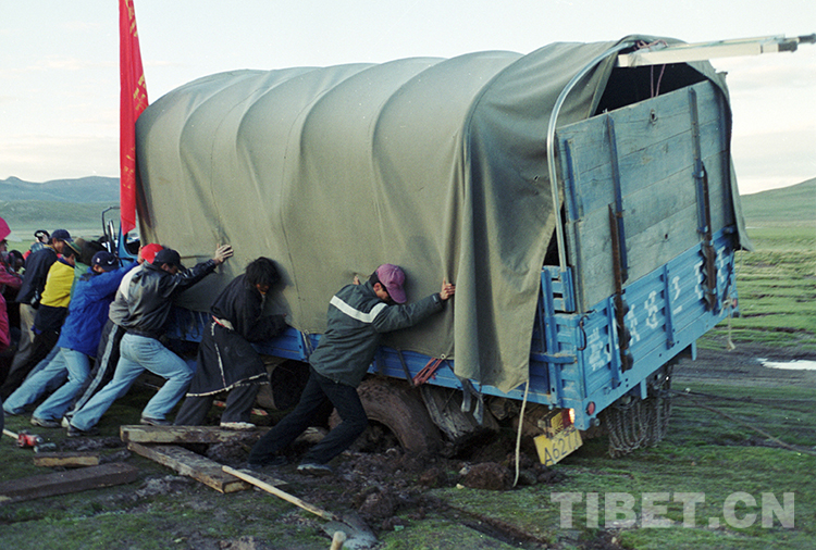 這是科考人員在奮力推出陷進(jìn)藏北無(wú)人區(qū)沼澤地帶的科考卡車(chē)(唐召明2001年攝)