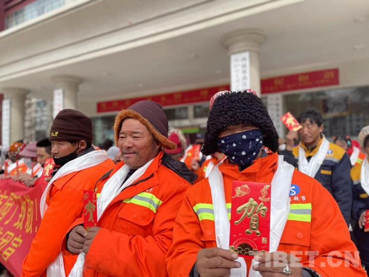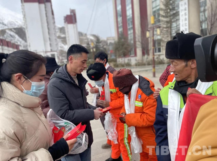 中國西藏網(wǎng)訊 2月28日,在藏歷新年到來之際,西藏自治區(qū)那曲市比如縣政府大樓前正在開展一場溫暖人心的慰問活動?!靶履旰?,給大家拜年了,衷心祝愿大家在新的一年里身體健康、工作順利?!?慰問現(xiàn)場,川英集團負責人向每位環(huán)衛(wèi)工人和城管協(xié)管員獻上潔白的哈達致以新年的美好祝福,感謝他們?yōu)楸热绛h(huán)衛(wèi)事業(yè)作出的貢獻,并送上1000元慰問金。(中國西藏網(wǎng) 記者/賈華加 比如縣宣傳部供圖)