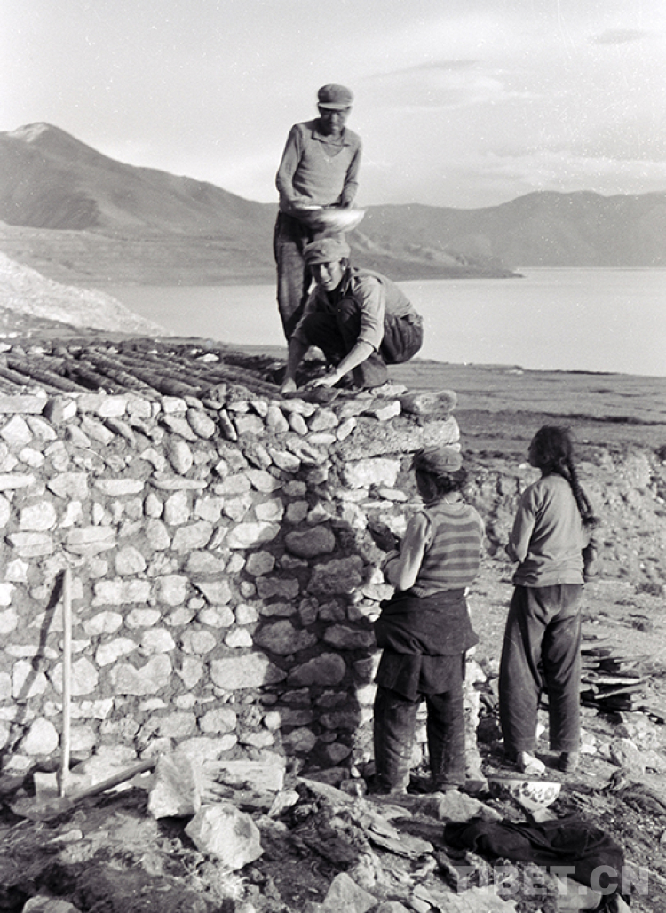 這是文部辦事處文部區(qū)文部鄉(xiāng)(現(xiàn)尼瑪縣文部鄉(xiāng)南村)的村民在當(dāng)惹雍錯(cuò)湖畔蓋石屋(唐召明1987年攝)