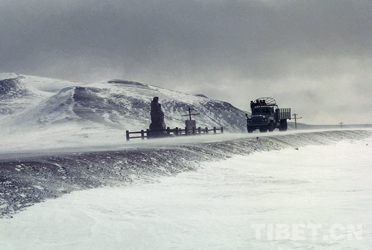 這是一輛汽車正在通過青藏公路海拔5231米的唐古拉山口(唐召明1991年攝)