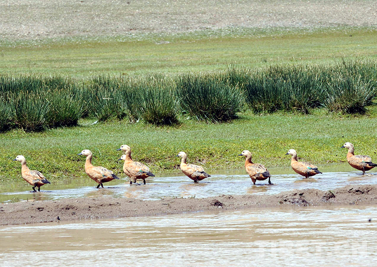 這是在藏北申扎縣境內(nèi)排隊(duì)行走的赤麻鴨(唐召明2009年攝)