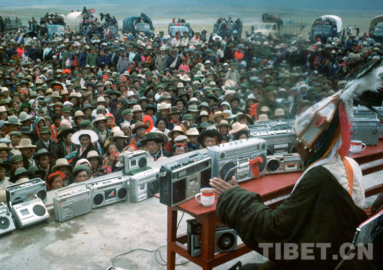 1987年盛夏的一天,藏北草原首府那曲鎮(zhèn)正在舉行一年一度的傳統賽馬會。只見這里各色帳篷林立,人山人海,商品交易繁忙。我遠遠看到,在一片寬廣的草地上,成百上千的觀眾盤腿坐著,靜聽露天舞臺上一個頭戴彩帽的人在比劃著什么。