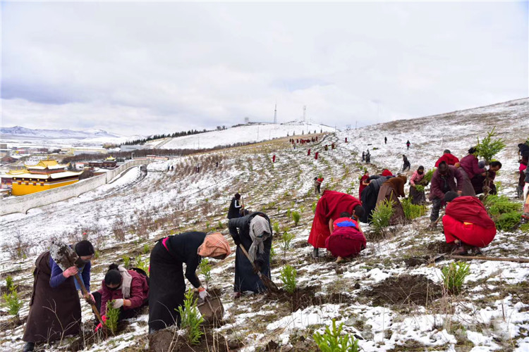 圖為達(dá)扎委員帶領(lǐng)達(dá)扎寺僧人和當(dāng)?shù)厝罕娭矘湓炝?/p>