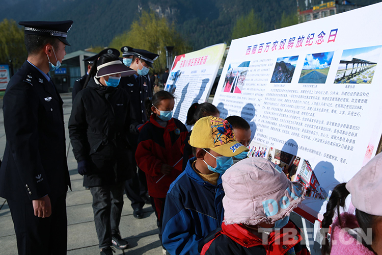 圖為觀看展板上關(guān)于“西藏百萬農(nóng)奴解放紀念日”的介紹