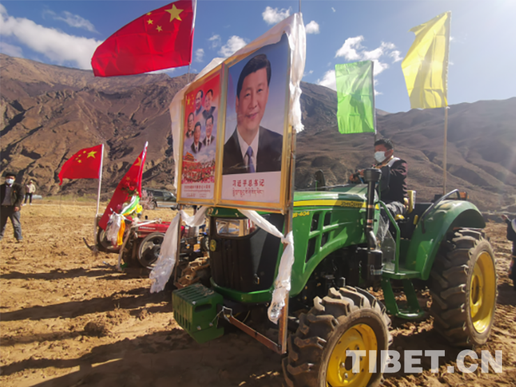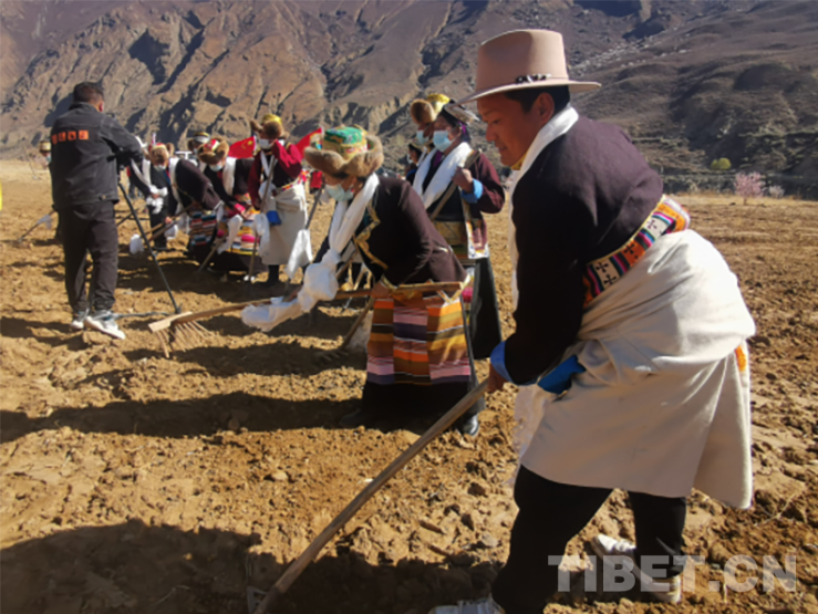 活動現(xiàn)場,群眾頭戴藏式金花帽,身著氆氌藏裝,或手持犁耙和鋤頭,或開著拖拉機,以吃切瑪、敬青稞酒、獻哈達、跳鍋莊、犁地、播種等傳統(tǒng)習俗,隆重慶祝共康村首屆開耕節(jié)。