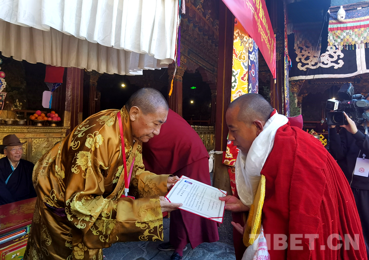 圖為中國佛教協(xié)會西藏分會常務副會長珠康·土登克珠活佛(左)向考僧頒發(fā)學位證書 攝影:王淑