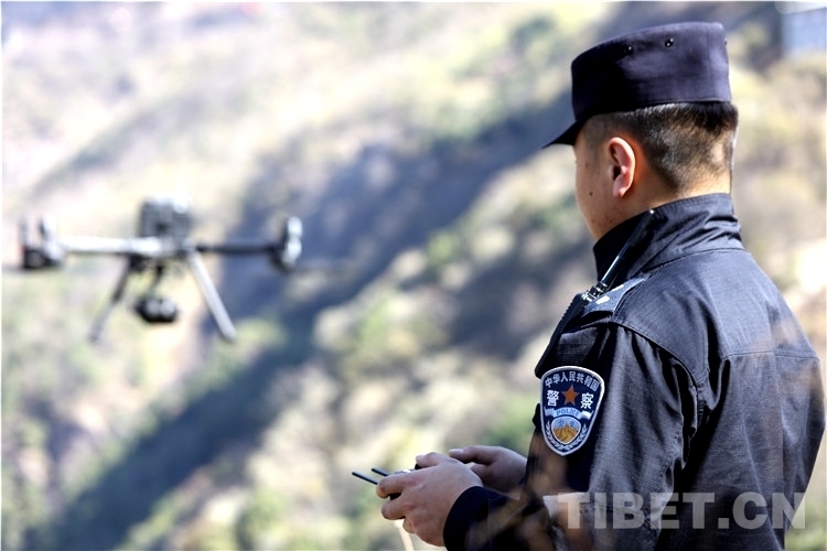 圖為民警利用無(wú)人機(jī)對(duì)波曲河道兩翼滑坡地段進(jìn)行勘測(cè) 攝影:鄒興國(guó)