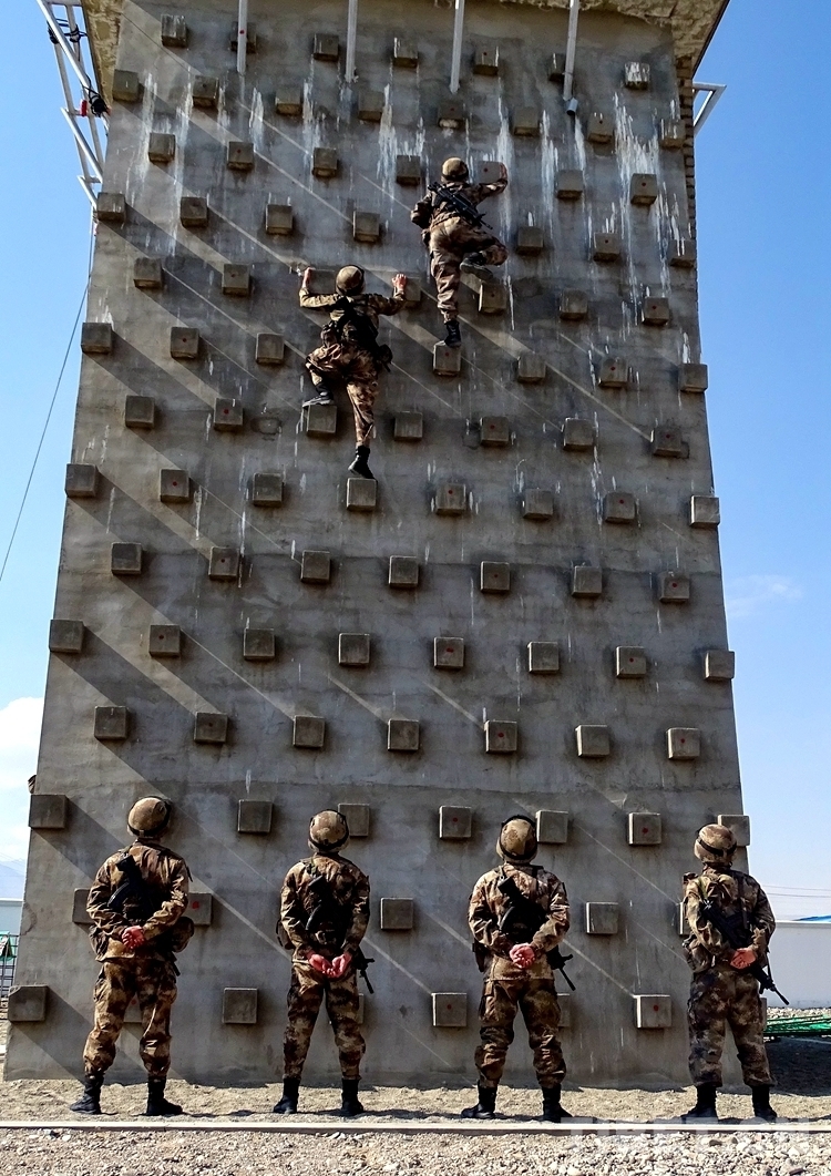 圖為阿里軍分區(qū)某部官兵進行攀巖訓(xùn)練