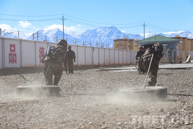 圖為阿里軍分區(qū)某部官兵進行拉輪胎訓(xùn)練