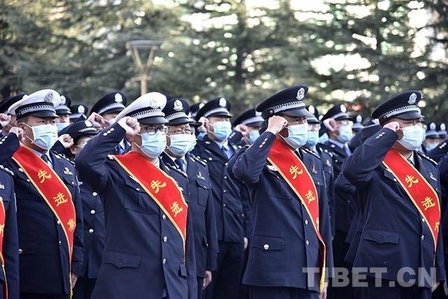 圖為2022年1月10日上午,西藏自治區(qū)公安廳組織民警迎接第二個(gè)中國(guó)人民警察節(jié)?,F(xiàn)場(chǎng),全體民警舉右拳進(jìn)行人民警察誓詞宣誓