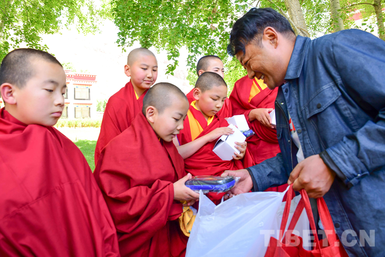 圖為佛學院老師代表相關單位向少年活佛贈送節(jié)日禮物 攝影:拉姆
