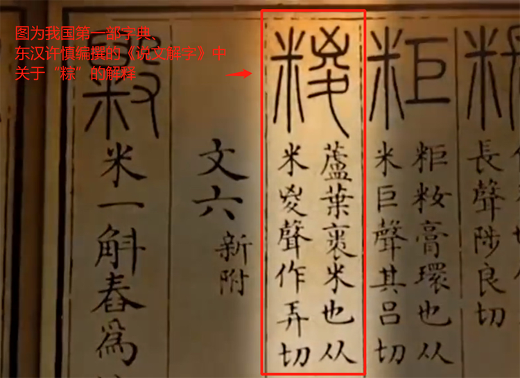 關(guān)于粽子,比較早的文字記載,在距今近2000年前,由東漢學(xué)者許慎編纂的我國(guó)第一部真正意義上的字典《說(shuō)文解字》中可以找到——“糉,蘆葉裹米也”。這個(gè)記載言簡(jiǎn)意賅地說(shuō)明了制作粽子的原料和方法?!凹F”字就是我們現(xiàn)在使用的“粽”字。
