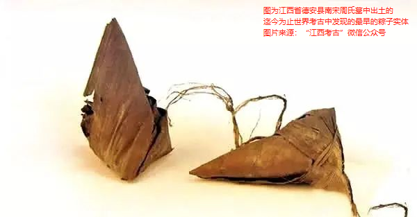 1988年,在江西省德安縣的南宋周氏墓中出土了迄今為止世界考古中發(fā)現(xiàn)的最早的粽子實(shí)體。有趣的是,開(kāi)棺時(shí),工作人員發(fā)現(xiàn),墓主的手上拿著一根桃木枝,而桃木枝上掛著的,赫然是兩個(gè)實(shí)體粽子。用粽子作陪葬品很少見(jiàn),據(jù)考古專(zhuān)家分析,墓主逝去于四月初十,大殮正值端午節(jié)前,可能生前愛(ài)吃粽子,所以就作為了陪葬品。據(jù)碑文記載,墓主周氏葬于公元1274年,所以,這是一對(duì)穿越了近750年時(shí)光來(lái)到我們面前的粽子。這對(duì)粽子呈菱角形,長(zhǎng)6厘米、寬3厘米,外皮為粽葉,用天然蘆葦葉麻線捆扎,制作手法和材料與我們現(xiàn)在的粽子非常相近。這對(duì)珍貴的南宋粽子目前保存在江西省德安縣博物館。