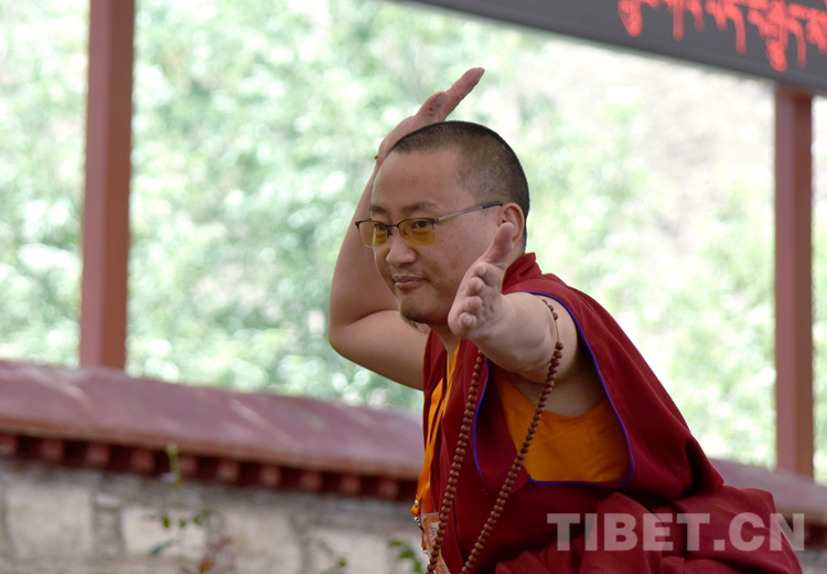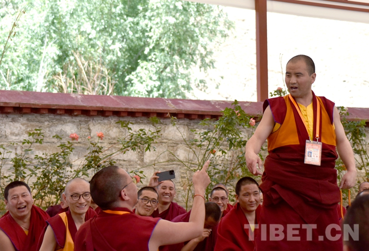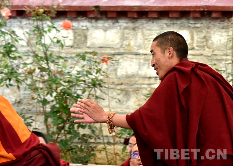 中國西藏網(wǎng)訊 身穿絳紅色袈裟,坐者仔細聆聽、站立者臂套念珠、迸出佛學(xué)妙語;圍觀者不時大笑……這是6月21日下午記者在西藏佛學(xué)院辯經(jīng)場看到的“唇槍舌戰(zhàn)”。