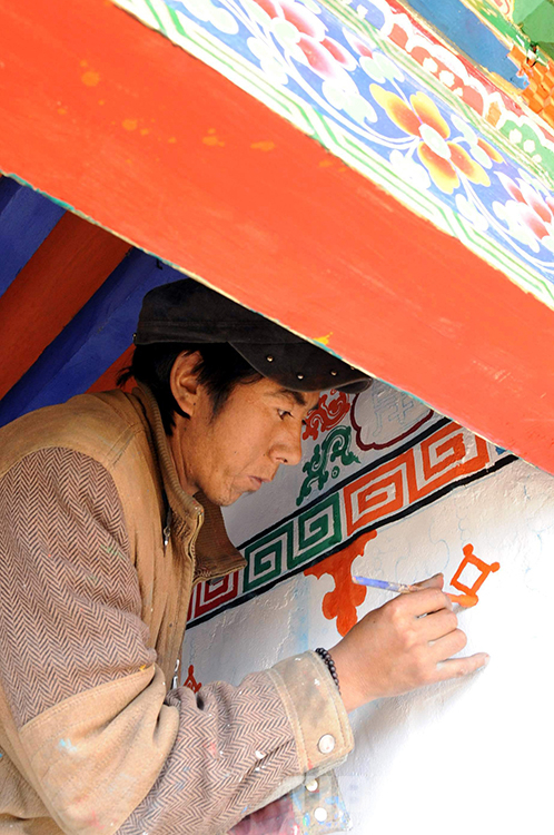 這是尼瑪縣文部鄉(xiāng)南村一戶人家請(qǐng)來畫師為自家安居新房進(jìn)行室內(nèi)彩繪(唐召明2009年攝)
