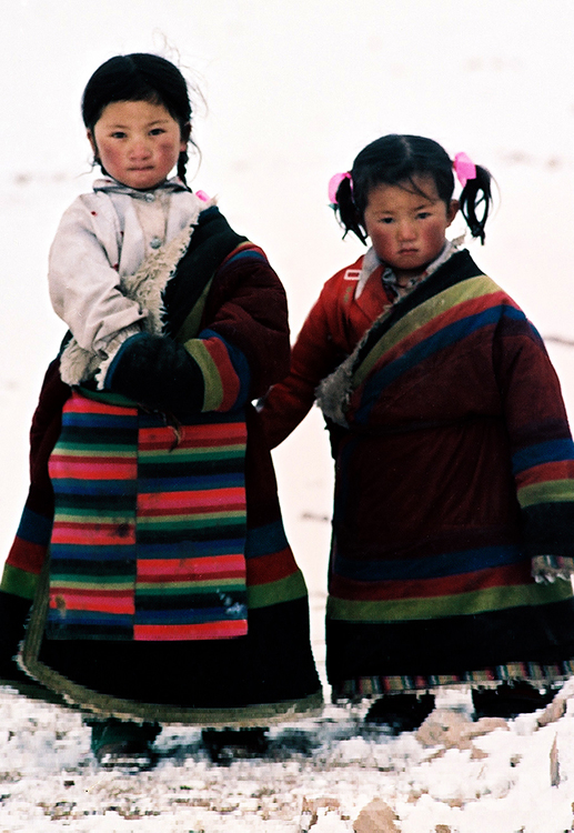 那是1989年歲末最后幾天,我隨藏北那曲地區(qū)(現(xiàn)那曲市)基層政權(quán)建設(shè)工作現(xiàn)場會“訪問團(tuán)”來到文部辦事處(現(xiàn)尼瑪縣)參觀。來到卓瓦鄉(xiāng)時(shí),我眼前突然一亮:在雪地上玩耍的草原小姐妹,三五歲的樣子,身著五彩羔皮藏袍,扎著羊角小辮,臉頰上印刻著深紫色“高原紅”。那是草原上一道最美麗的風(fēng)景線,我不由得按動手中相機(jī)快門……