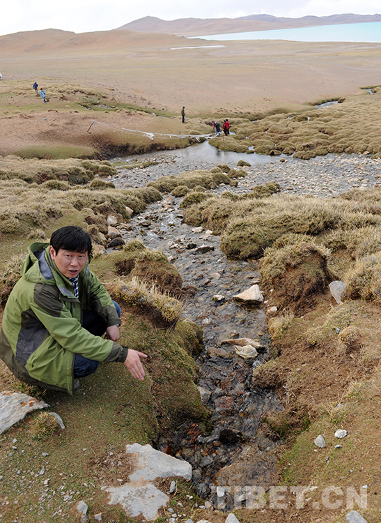 這是王飛在班戈縣青龍鄉(xiāng)六村“浩秀泉”水旁,介紹班戈縣與中國石化將合作開發(fā)的冰川礦泉水項目(唐召明2015年5月20日攝)