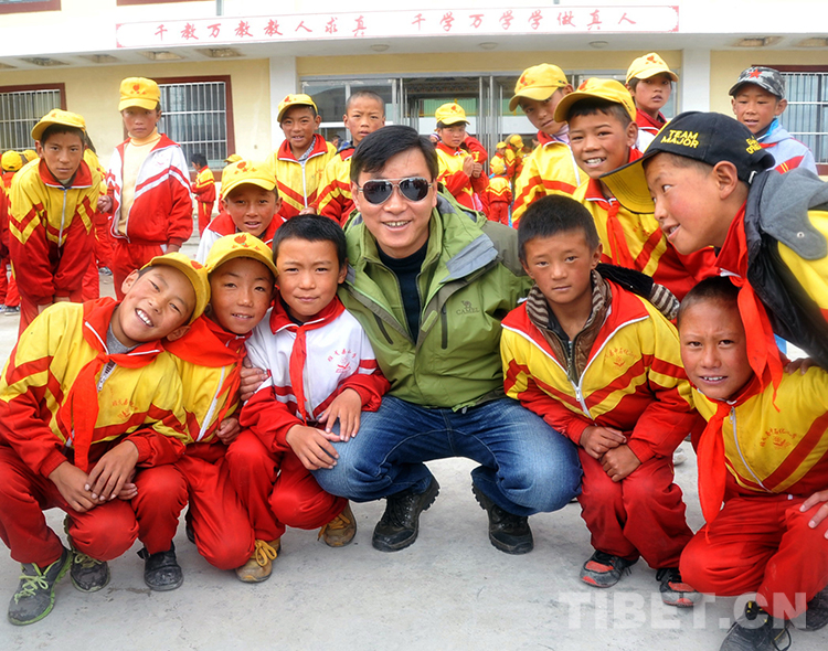 這是王飛在看望中國石化班戈縣小學(xué)的藏族孩子時合影留念(唐召明提供,2013年8月30日攝)