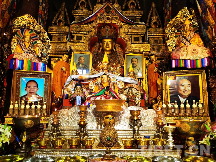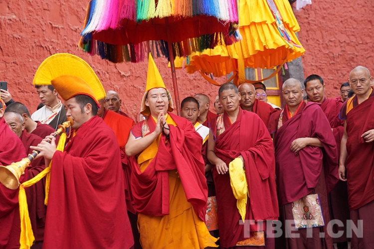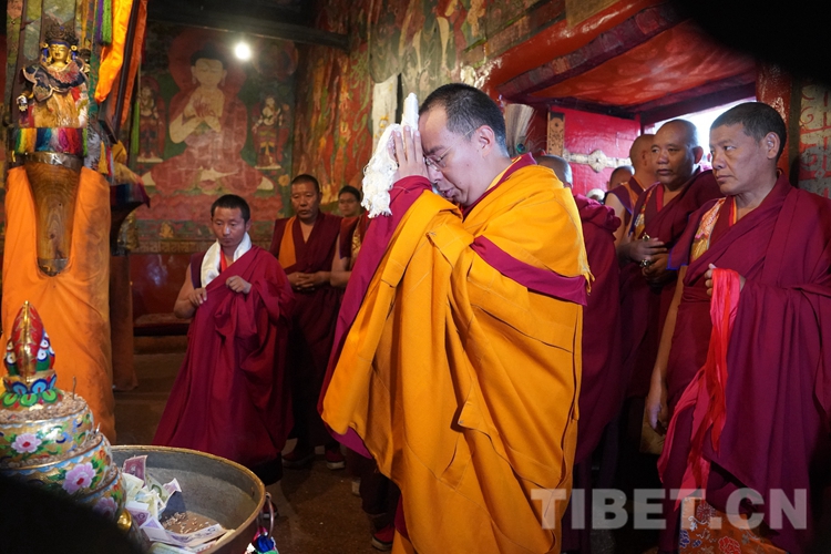 在措欽大殿,班禪虔誠叩拜供奉于此的佛祖釋迦牟尼佛像和藏傳佛教格魯派始祖宗喀巴塑像,與眾僧共同念誦經文后,回到寢宮拉讓殿。下午,班禪登上拉讓日光殿寶座,接受扎什倫布寺管委會僧人成員、高僧朝拜,并為他們摸頂賜福,帶領高僧誦經祈福。