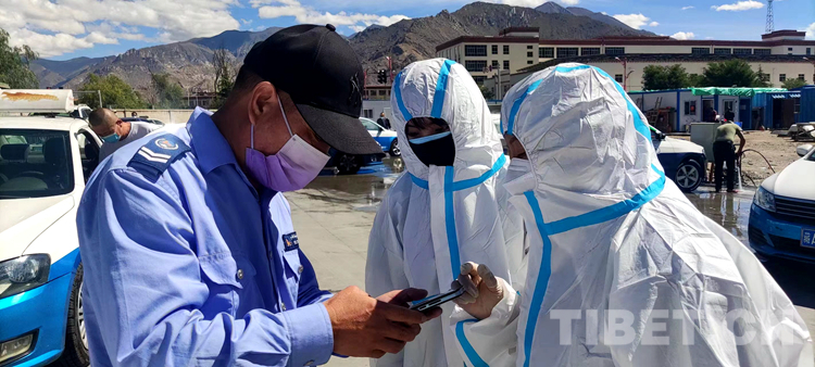 圖為在拉薩貢布堂路出租車洗車消毒點,出租車駕駛員和兩位防疫志愿者交流核酸檢測結(jié)果查詢 攝影:趙良發(fā)