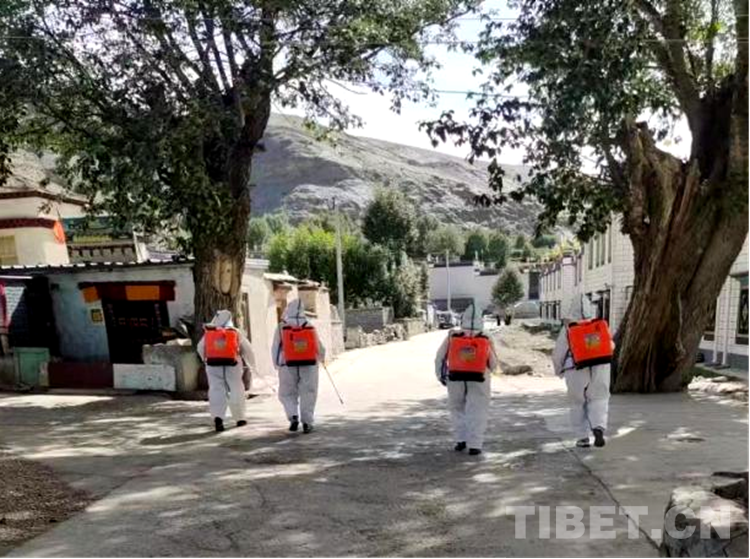圖為志愿服務隊志愿者們在拉隆村進行消毒工作