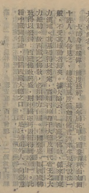次年,應(yīng)重慶漢藏教理院和成都佛學(xué)社的邀請(qǐng),東本格西決定前往當(dāng)?shù)刂v法。期間,日本空襲不斷,拉薩官民與弟子因憂慮東本格西安危,力勸其勿前往。但是,東本格西從佛教利益世間的角度出發(fā),認(rèn)為在當(dāng)?shù)孛癖娍嚯y之際,作為僧人更應(yīng)不懼危險(xiǎn),前往當(dāng)?shù)匚拷迕癖?,以紓解?zhàn)爭(zhēng)造成的創(chuàng)傷與苦痛。1943年1月,東本格西從拉薩啟程前往理化(今理塘),參加九世班禪靈童尋訪測(cè)驗(yàn)事宜。4月,經(jīng)由康定抵達(dá)成都,沿途受到各地政府官員與僧俗弟子的歡迎。東本格西應(yīng)中國(guó)邊疆問(wèn)題研究會(huì)邀請(qǐng)講演“佛教與邊疆”,蒙藏委員會(huì)委員格桑澤仁翻譯。[3]講演內(nèi)容主要分為三部分:首先,詳細(xì)敘述藏傳佛教發(fā)展演變的歷史,提出因于歷代高僧與中央政府的大力維護(hù)與資助,藏傳佛教發(fā)展的基礎(chǔ)才得以奠定;其次,分析邊疆佛教的分布與信仰狀況;最后,分析佛教與邊疆的關(guān)系。[4]他在講到佛教昌盛與國(guó)家實(shí)力發(fā)展之間的關(guān)系時(shí),明確提出“西藏之佛教,必須國(guó)力保護(hù),中國(guó)強(qiáng)盛,則藏傳佛教得以發(fā)揚(yáng),藏傳佛教興盛,則中國(guó)亦可因而得到幸?!盵5]。東本格西從歷史和現(xiàn)實(shí)角度詮釋西藏作為中華民族共同家園的角色,邊疆不惟具體的地理概念和信仰文化差異的標(biāo)簽,而是中央政府長(zhǎng)期支持發(fā)展的歷史凝結(jié),是中華民族共同家園的一分子。