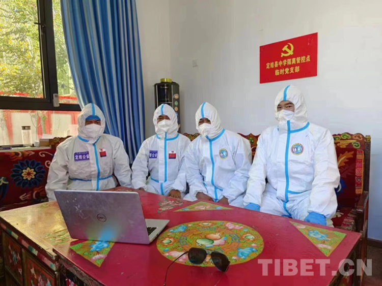 圖為10月16日上午,西藏自治區(qū)日喀則市定結縣中學隔離管控點一線“戰(zhàn)”疫工作人員收看黨的二十大開幕會直播