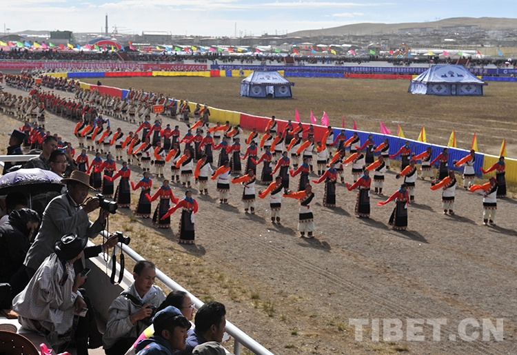 這是來自那曲地區(qū)(現(xiàn)那曲市)各縣代表隊(duì)在進(jìn)行入場(chǎng)式表演。當(dāng)日,那曲賽馬藝術(shù)節(jié)在藏北首府那曲鎮(zhèn)開幕(唐召明2013年8月10日攝)