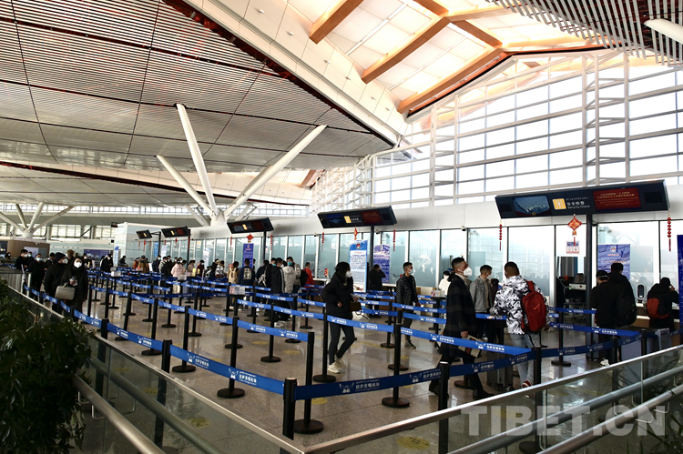 圖為春運首日拉薩貢嘎機場內候機的旅客