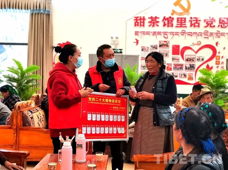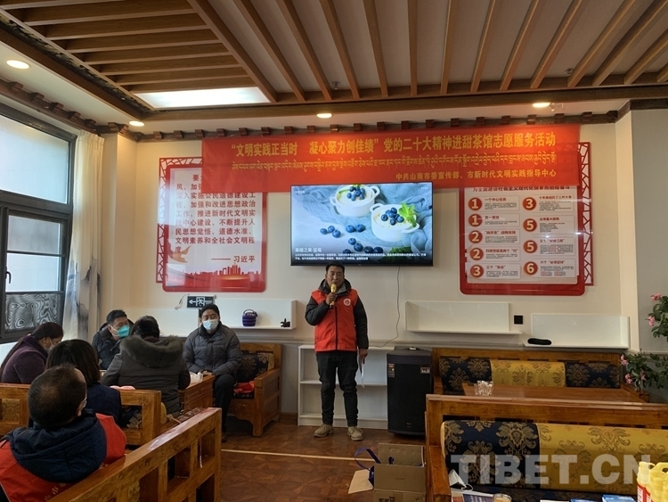 圖為山南市委宣傳部、山南市文明辦在文明實踐示范點開展黨的二十大精神進甜茶館志愿服務(wù)活動