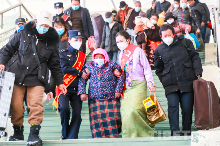 圖為拉薩鐵路公安處“格?;ā迸泳M民警與拉薩火車站志愿者共同為老年出行旅客提供幫助(胡安鵬 攝)