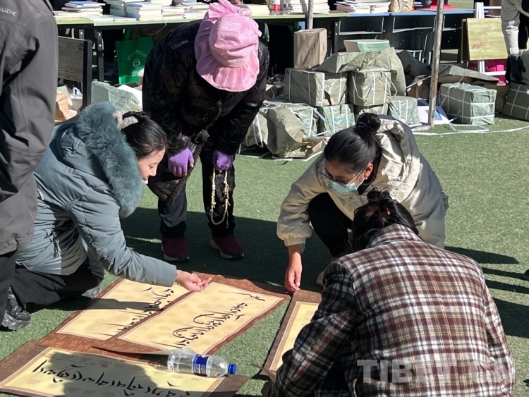 圖為書法家為群眾書寫新年祝福(書寫內(nèi)容:扎西德勒) 攝影:德吉卓瑪
