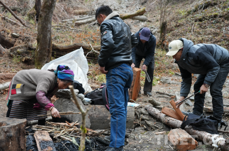 過了兩個(gè)小時(shí),我們到達(dá)了平時(shí)巡邊人休息的地方。有人撿柴火、有人去接水,每個(gè)人都分工明確。扎西江村的背包里帶著方便面、優(yōu)樂美奶茶、可樂等,巡邊的每位隊(duì)員都拿出了自己包里的食物與大家分享。大家圍坐一起有說有笑,完全忘記了一路的艱辛與疲憊。