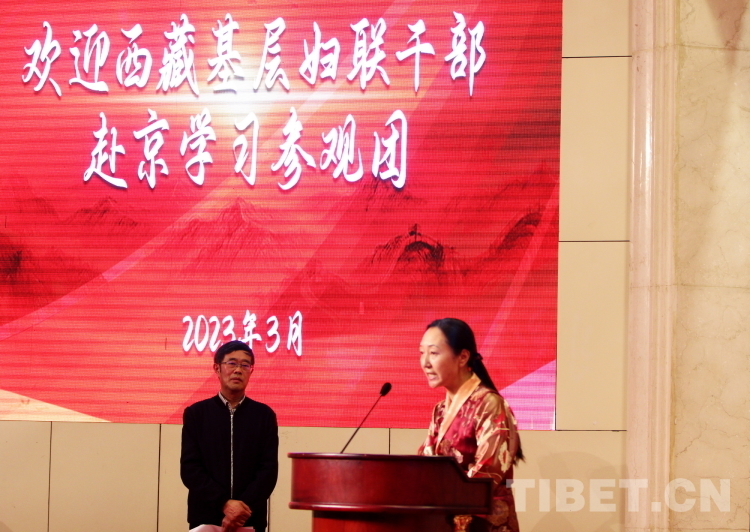 圖為西藏自治區(qū)婦聯(lián)黨組成員、副主席澤仁卓嘎(右一)在北京建藏援藏工作者協(xié)會在北京西藏大廈為“2023年西藏基層婦聯(lián)干部赴京學(xué)習(xí)參觀團”成員們舉行的歡迎會上發(fā)言 攝影:劉莉