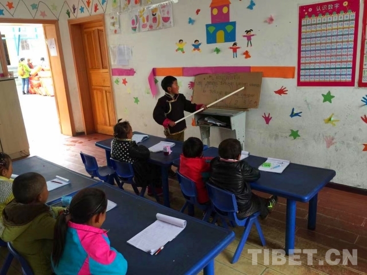 圖為山南洛扎縣生格鄉(xiāng)的學校(含幼兒園到小學3年級),孩子使用老師做的詞卡做小老師 2016年拍攝