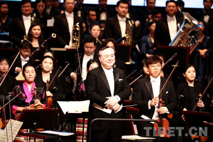本場(chǎng)音樂會(huì)由中國(guó)文聯(lián)副主席、書記處書記,中央音樂學(xué)院院長(zhǎng),著名指揮家俞峰擔(dān)任指揮,中央音樂學(xué)院交響樂團(tuán)與西藏自治區(qū)歌舞團(tuán)愛樂樂團(tuán)聯(lián)合伴奏。圖為本場(chǎng)音樂會(huì)指揮俞峰(前排中) 攝影:劉莉