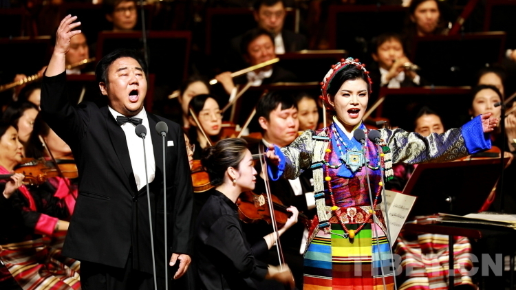 圖為中音歌唱家、國(guó)家一級(jí)演員霍勇,西藏自治區(qū)歌舞團(tuán)青年女高音次仁央宗領(lǐng)合唱《美麗的西藏 可愛的家鄉(xiāng)》 攝影:劉莉