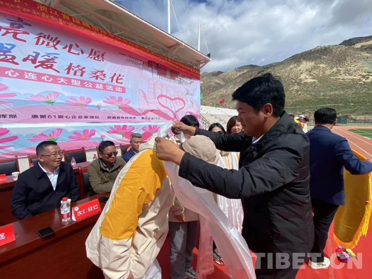 中國西藏網(wǎng)訊 6月19日,浙江金華市惠聚61愛心企業(yè)家團(tuán)隊(duì)萬里送愛心,在西藏森布日中學(xué)舉行“點(diǎn)亮微心愿·溫暖格?;ā惫婊顒?dòng)。