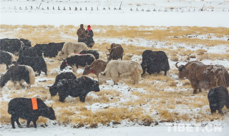 資料圖:雪中牧民群眾驅趕牦牛群回家