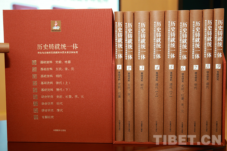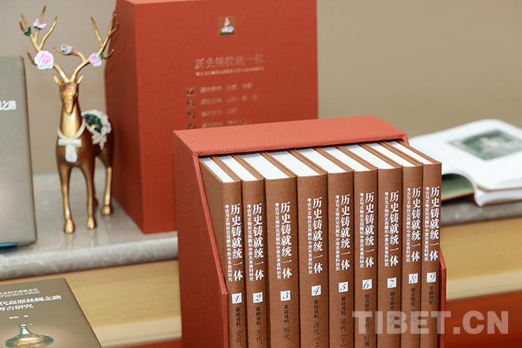 圖為發(fā)布會現(xiàn)場展覽的《歷史鑄就統(tǒng)一體:考古與文物所見西藏和中原關(guān)系資料研究》全套圖書 攝影:陳衛(wèi)國