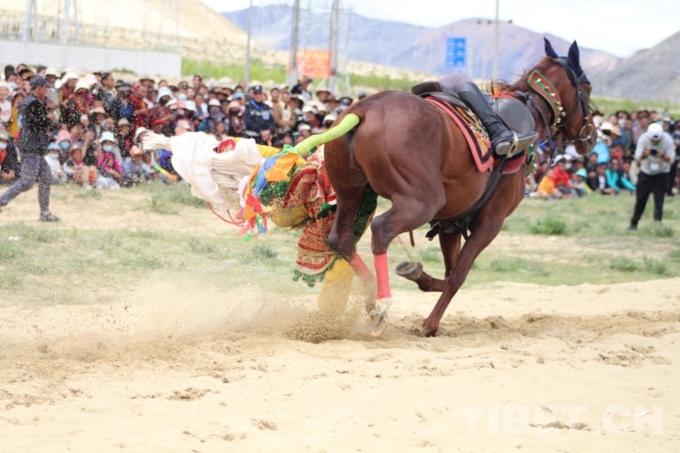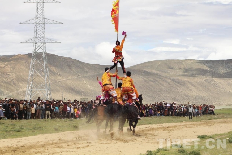 賽馬運(yùn)動(dòng)是藏族群眾十分喜愛的傳統(tǒng)體育運(yùn)動(dòng)之一,對(duì)于藏族人而言,參加賽馬和觀看賽馬能帶來好運(yùn)。下午,來自西藏自治區(qū)馬術(shù)團(tuán)的選手們通過單人單馬、馬上射箭、馬上拾哈達(dá)、馬上敬酒、馬上仰背、多人多馬等表演,呈現(xiàn)了一場(chǎng)激動(dòng)人心的馬術(shù)表演。表演期間當(dāng)選手們做出高難度的動(dòng)作時(shí)現(xiàn)場(chǎng)觀眾神情緊張,當(dāng)選手們順利完成表演時(shí),現(xiàn)場(chǎng)高聲叫好、掌聲連連。