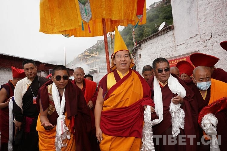 當(dāng)日11時許,在眾僧的期盼中,班禪一行抵達(dá)直孔替寺。頓時,現(xiàn)場法號齊鳴、法螺合奏,直孔瓊倉·洛桑強巴活佛和僧眾在寺廟前舉行了隆重的歡迎儀式。