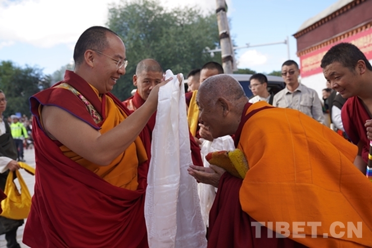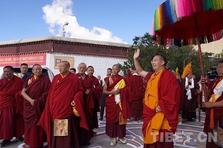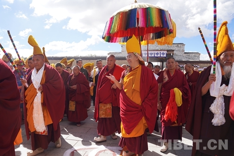 班禪一行順利抵達(dá)后,現(xiàn)場(chǎng)桑煙繚繞、法號(hào)長鳴,扎什倫布寺高僧代表向班禪敬獻(xiàn)哈達(dá),班禪向僧眾及在此等候的信眾們揮手致意。隨后,班禪在手持黃傘、香爐的高僧引領(lǐng)下徐徐而行,經(jīng)多加大院進(jìn)入措欽大殿。