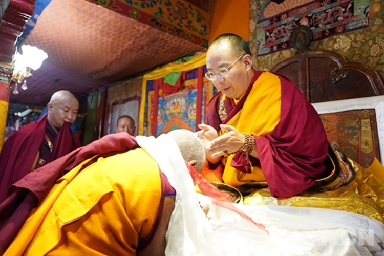 在措欽大殿,班禪虔誠叩拜供奉于此的佛祖釋迦牟尼佛像和藏傳佛教格魯派始祖宗喀巴佛像,與僧眾共同念誦經(jīng)文,之后回到寢宮拉讓殿。