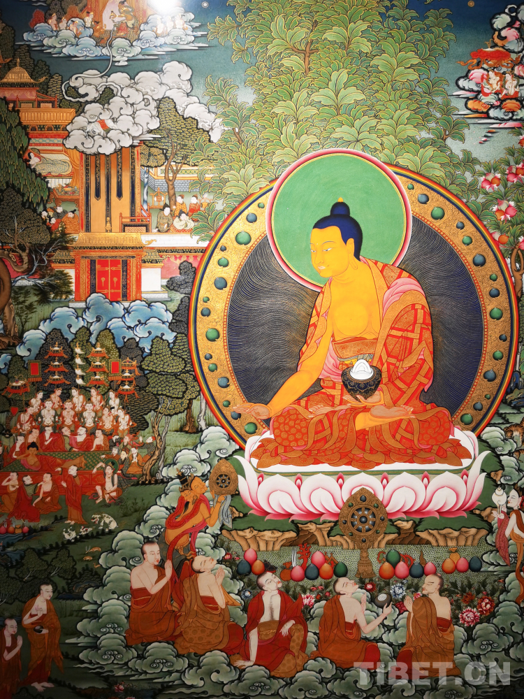 “這幅唐卡作品中只有一尊主尊佛的形象,就是我們現(xiàn)在所看到的文殊菩薩,這是藏、漢民族都熟知的形象,通過文殊菩薩更容易建立起文化交流、溝通的橋梁。”西藏著名唐卡畫師夏魯旺堆正在向觀展的游客介紹自己所創(chuàng)作的唐卡作品。