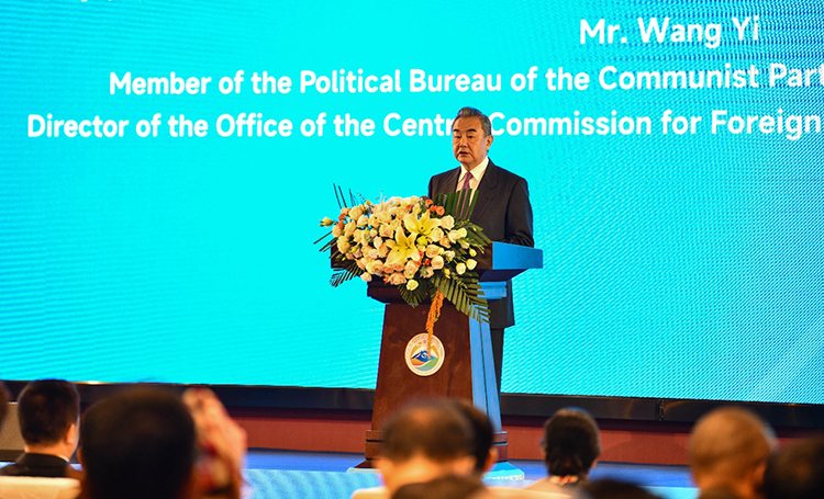 圖為開幕式暨主旨論壇現(xiàn)場中共中央政治局委員、中央外事工作委員會(huì)辦公室主任、外交部部長王毅在致辭 攝影:新華社記者晉美多吉
