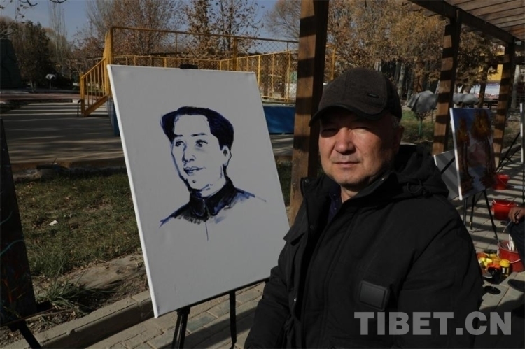 來到作畫區(qū)域,首先吸引記者注意的便是身穿黑衣、頭戴灰帽的西爾艾力·艾買提老人。在雪白的畫布前,老人用藍(lán)色和墨色顏料深淺描繪,勾勒出我們最熟悉的面孔。他向我們介紹說:“我畫的是我們偉大的毛主席年輕時候。沒有毛主席,我們中國人的生活不是這個樣子的,我很感恩他。我畫毛主席就是想讓更多人看見,讓他的故事得到更好的緬懷?!?/span>