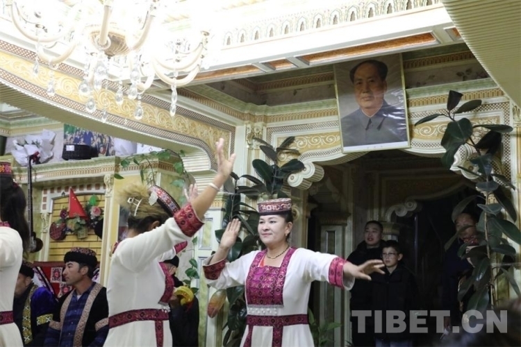一路前行,在喀什地區(qū)澤普縣的布依魯克塔吉克風(fēng)情小鎮(zhèn),美輪美奐的獨(dú)棟小院是小鎮(zhèn)居民區(qū)的特色,在夕陽的映襯下顯得格外溫馨舒適。好客的塔吉克族老人巴哈爾古麗·熱扎熱情地邀請走訪團(tuán)一行前往家里做客。穿過小院,一進(jìn)客廳就看見門廳上方懸掛著的毛主席畫像。當(dāng)所有人落座后,鷹笛聲響起,身穿塔吉克民族服飾的人們開始翩翩起舞,充滿了載歌載舞的歡樂氣氛。